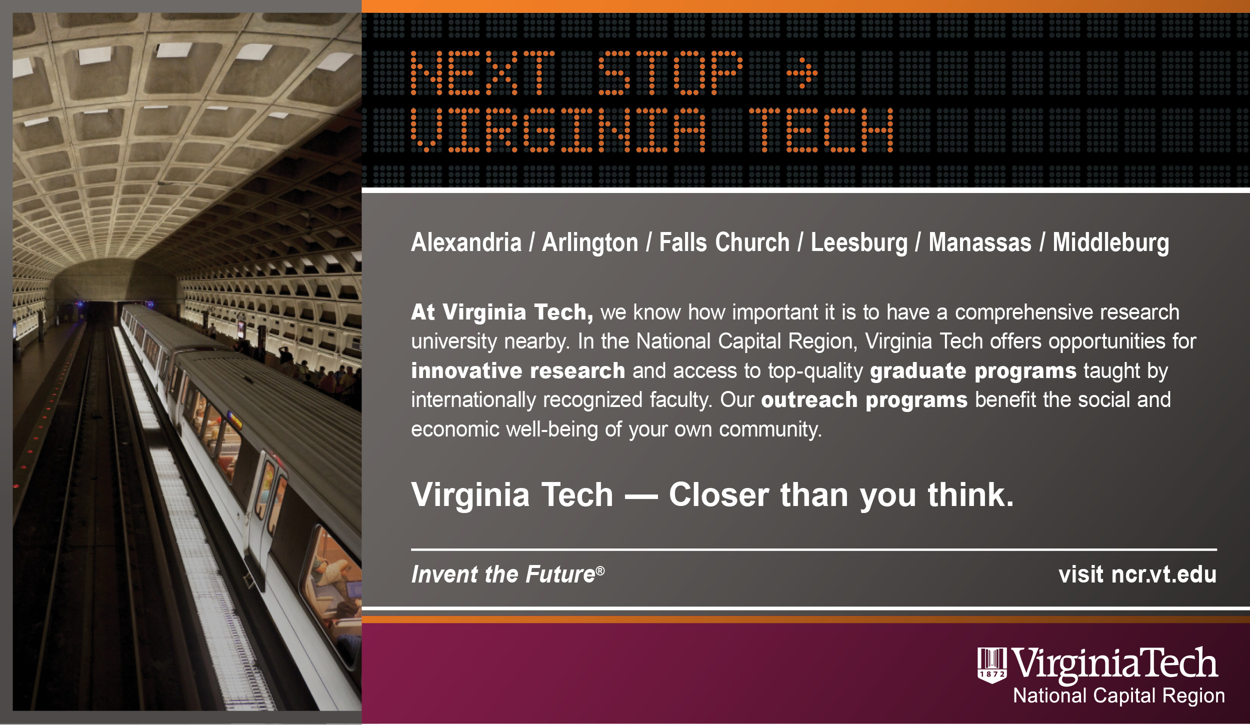 An ad campaign for Virginia Tech’s graduate programs in the Washington, DC region. The concept, tagline and design for this campaign were conceptualized to appeal to the needs of the target market: mid-career professionals looking for a convenient location to continue their studies. Of utmost importance was building awareness that Virginia Tech offered courses in the DC region and not just the main campus several hours away. The “Next Stop -> Virginia Tech” concept plays on the subway accessibility of the DC campuses, as well as Virginia Tech being the “next stop” to building a successful career. Social media graphics, digital ads, print ads, flyers, posters and billboards were placed in high-visibility locations.