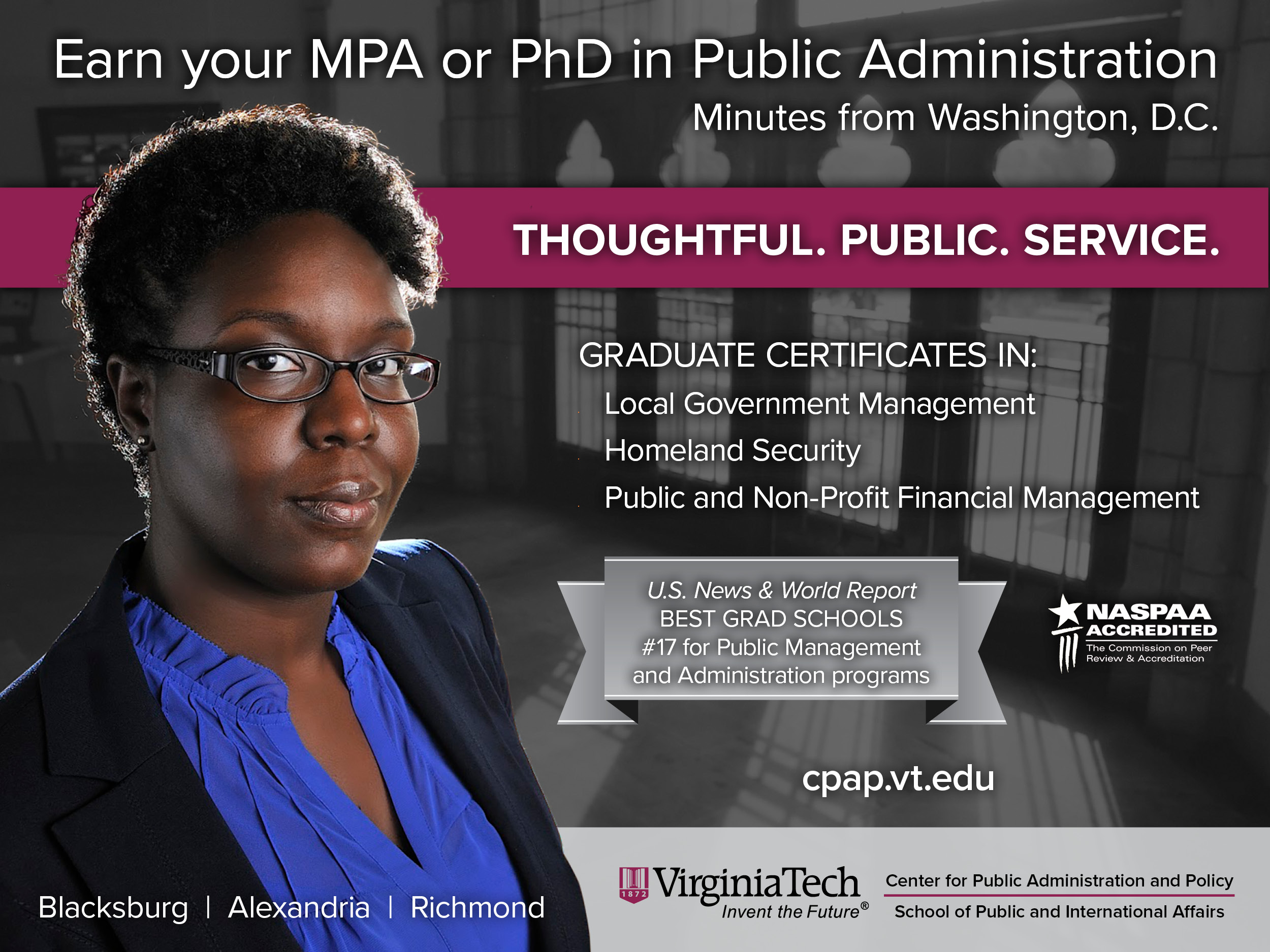 Ad design for Virginia Tech’s Center for Public Administration & Policy to appear in Governing magazine, promoting their graduate programs in Public Administration as well as their selection as a U.S. News & World Report Best Grad School....
