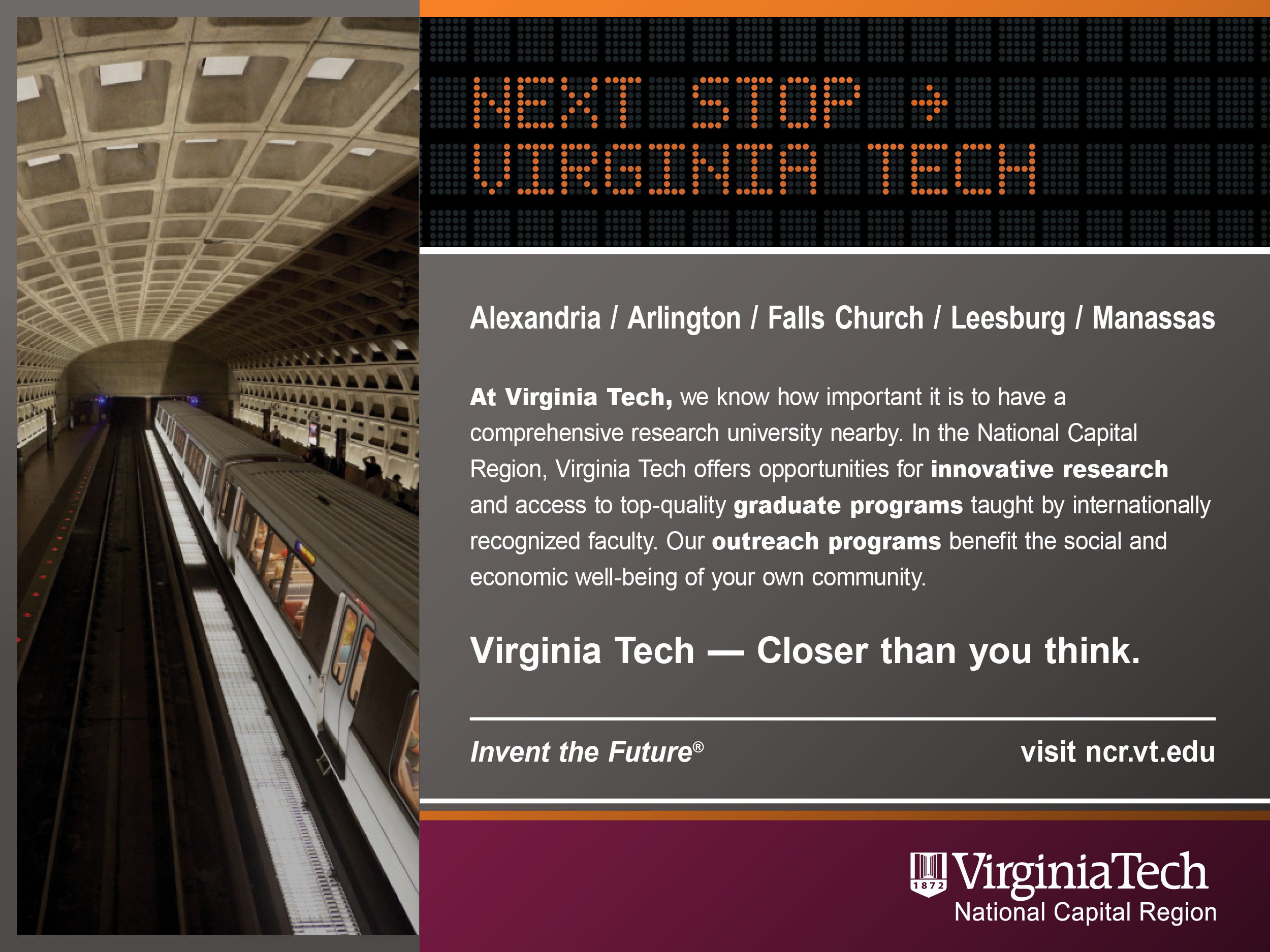 An ad campaign for Virginia Tech’s graduate programs in the Washington, DC region. The concept, tagline and design for this campaign were conceptualized to appeal to the needs of the target market: mid-career professionals looking for a convenient location to...