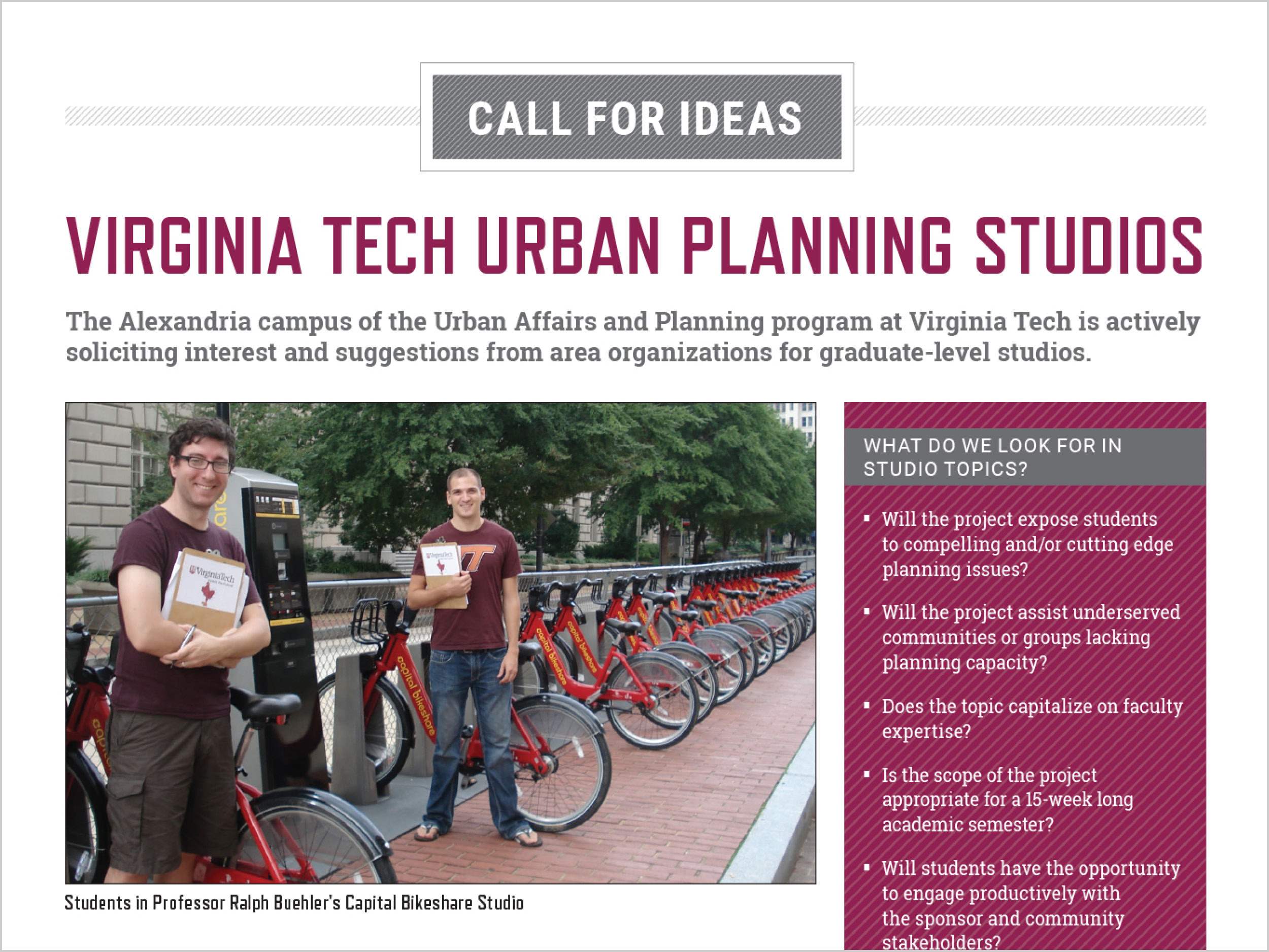 This flyer serves as a Call for Ideas for the Virginia Tech School of Public and International Affairs Urban Affairs and Planning program’s graduate-level studio program. The same design elements are carried through in presenting results of the studios in 4-8...